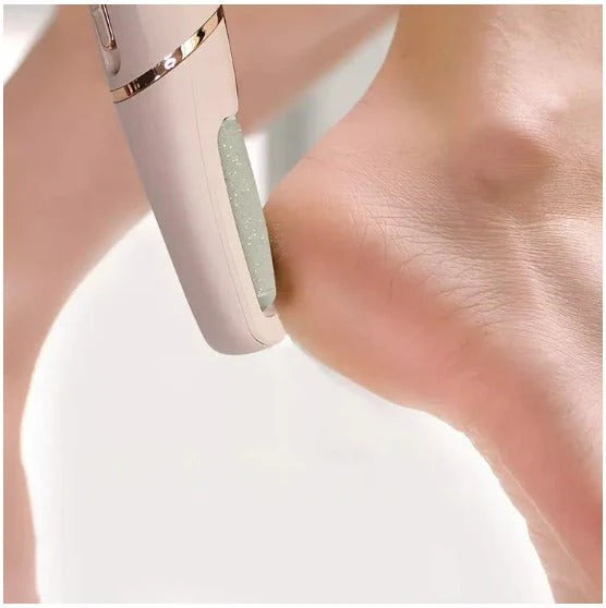 - Pedicura perfecta: Enciende la lima de pies y deslízala suavemente sobre la piel. Su rotación de alta velocidad elimina eficazmente las células muertas.