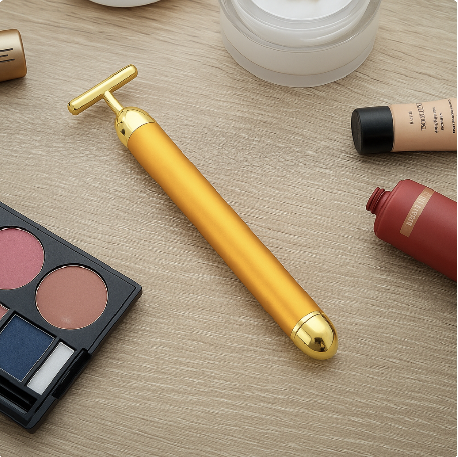 Masajeador facial en forma de “T” con vibración de alta frecuencia que estimula la circulación, relaja los músculos y mejora la absorción de cremas y sérums. Ligero, portátil y fácil de usar para una piel más firme, luminosa y fresca.